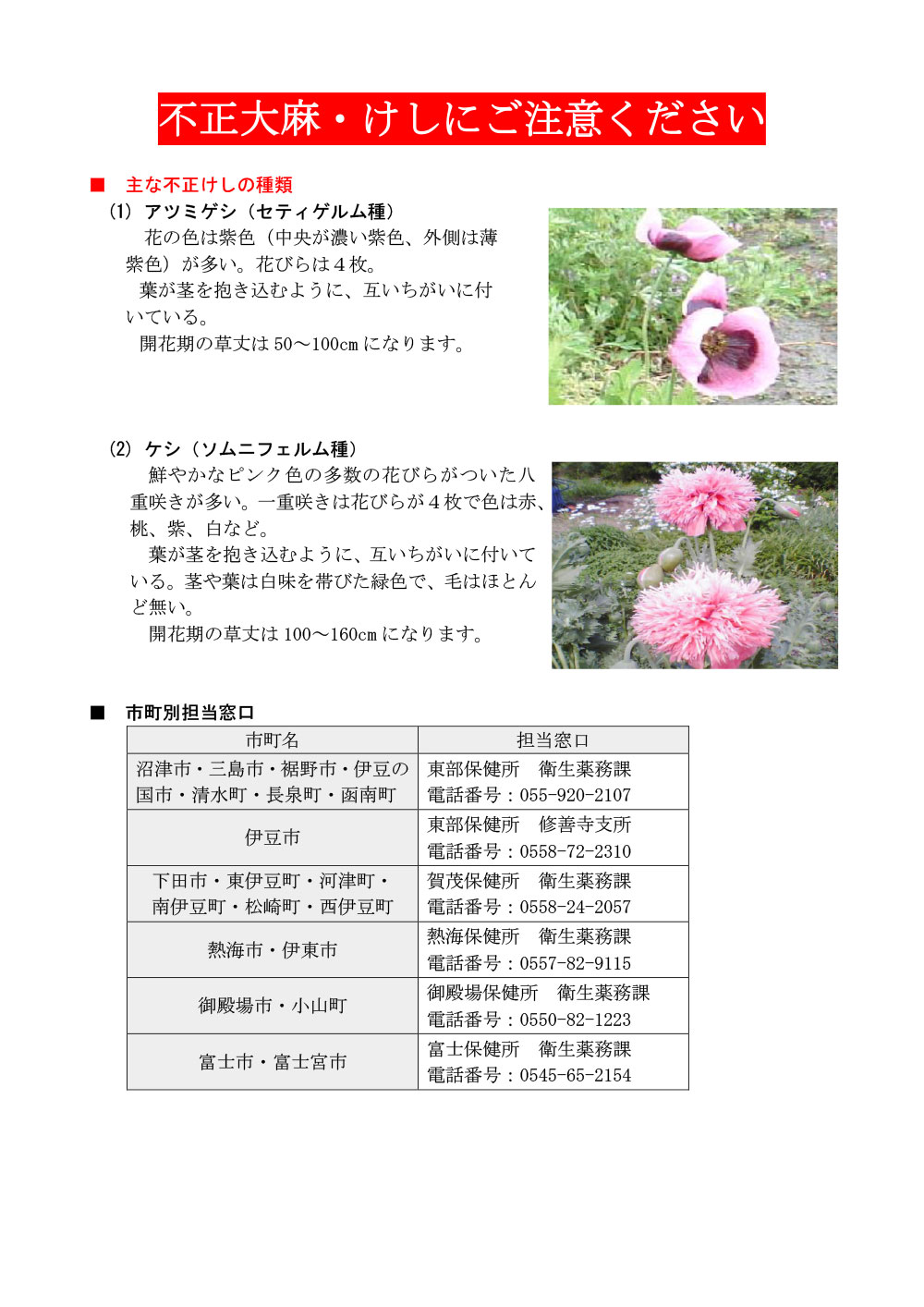 静岡県では、毎年5月から6月にかけて不正大麻・けし撲滅運動を実施しています。