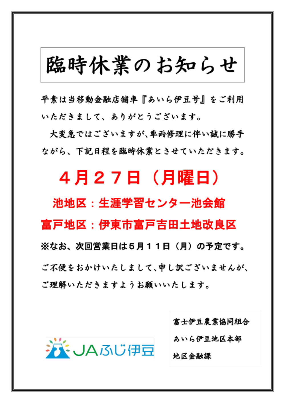 2026年04月21日 移動金融店舗 『あいら伊豆号』 臨時休業のお知らせ(4/27)