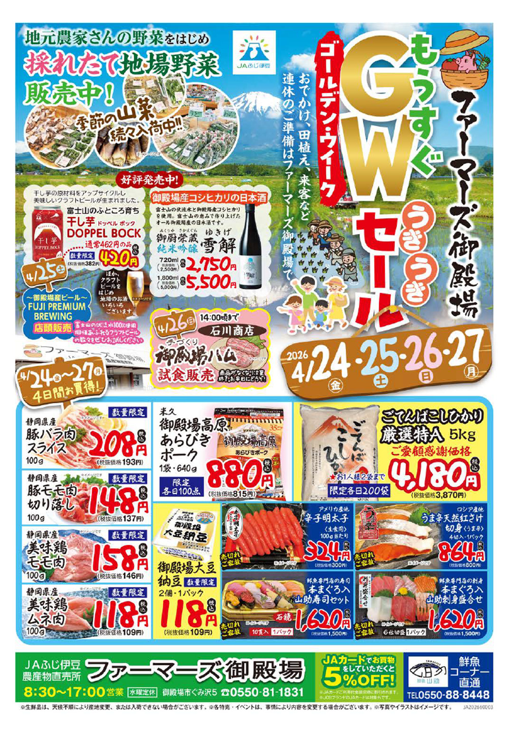2026年04月23日 ファーマーズ御殿場 もうすぐGW(ゴールデンウィーク)うきうきセール(4/24~27)のお知らせ