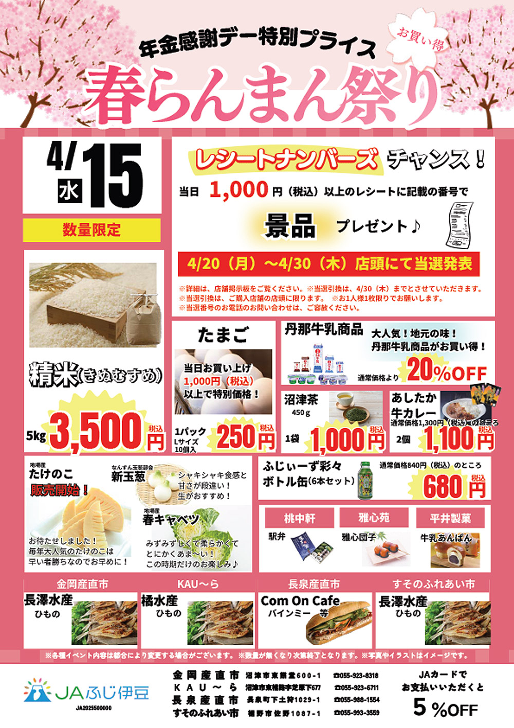 ファーマーズなんすん4店舗(金岡産直市・KAU~ら・長泉産直市・すそのふれあい市)では、春らんまん祭りを開催します!皆さまのご来店をお待ちしております。